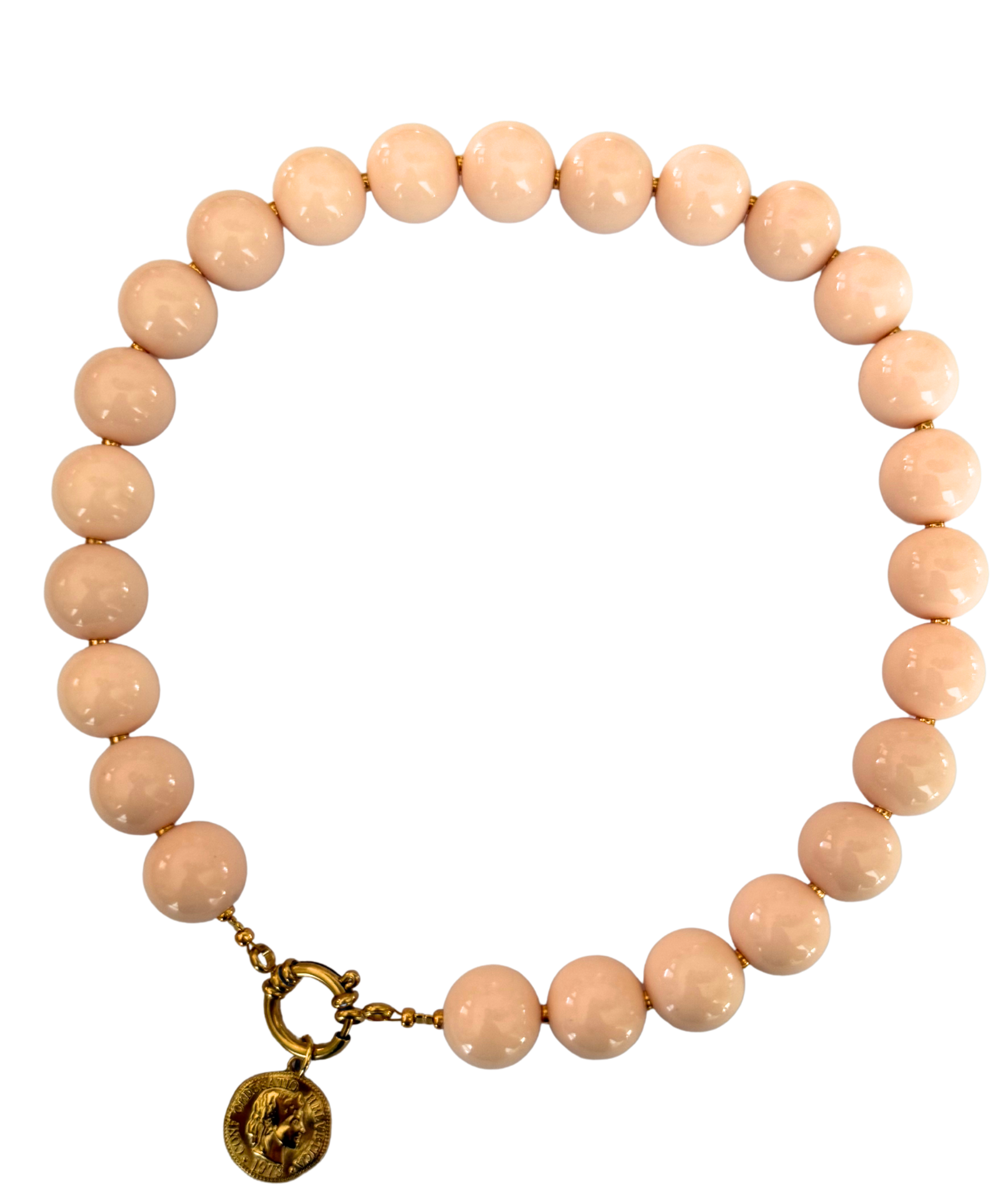 Chunky, speels en onweerstaanbaar stijlvol. De Nude Peach Necklace is dé finishing touch voor elke outfit, van je favoriete oversized sweater tot een chique avondlook. Met de hand gemaakt in Nederland, waardoor elke halsketting net zo uniek is als jij.